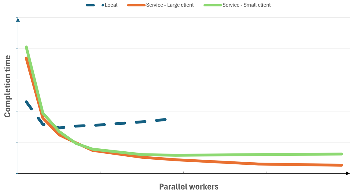 The following chart gives an example of running a test suite. By running the test suite with Playwright Workspaces instead of locally, you can significantly increase the parallelism and reduce the test completion time. Notice that, when running with the service, the completion time reaches a minimum limit, after which adding more workers only has a minimal effect. The chart also shows how using more computing resources on the client machine positively affects the test completion time for tests running with the service.