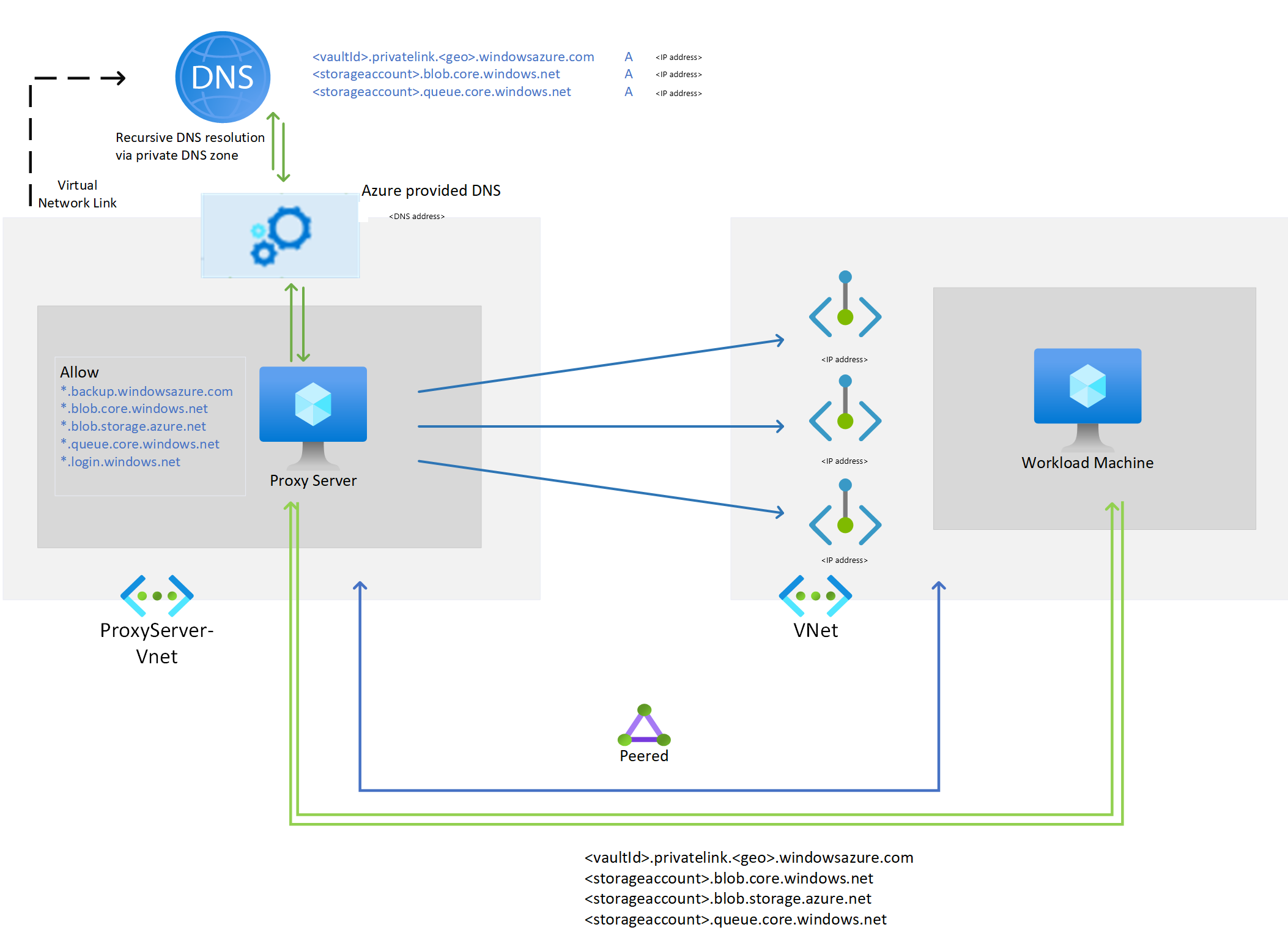 *.privatelink.<geo>.backup.windowsazure.com,*.privatelink.blob.core.windows.net,*.privatelink.queue.core.windows.net) with the VNET where proxy server is created or uses a custom DNS server with the respective DNS entries.
