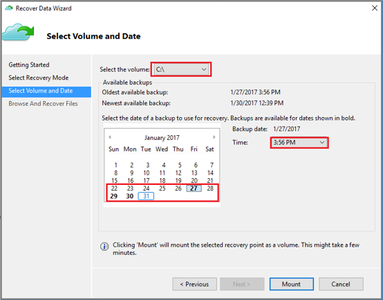 On the Select Volume and Date page, select the volume that contains the files or folders you want to restore, and select Mount. Select a date, and select a time from the drop-down menu that corresponds to a recovery point. Dates in bold indicate the availability of at least one recovery point on that day.