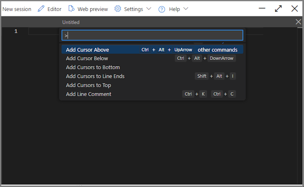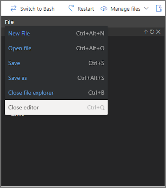 Azure Cloud Shell includes an integrated file editor built from the open source Monaco Editor. The Cloud Shell editor supports features such as language highlighting, the command palette, and a file explorer.