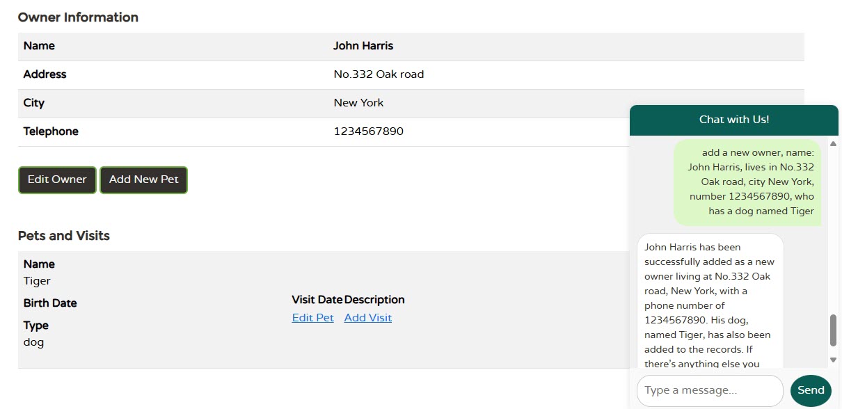 The following image shows the result of asking the application to add a new pet owner to the system: