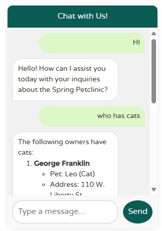 (✓) Done: Resource group: rg-my-first-ai (5.977s) (✓) Done: Virtual Network: vnet-my-first-ai (7.357s) (✓) Done: Container Registry: crb36onby7z5ooc (25.742s) (✓) Done: Azure OpenAI: openai-my-first-ai (25.324s) (✓) Done: Foundry Tools Model Deployment: openai-my-first-ai/text-embedding-ada-002 (42.909s) (✓) Done: Foundry Tools Model Deployment: openai-my-first-ai/gpt-4o (44.21s) (✓) Done: Container Apps Environment: aca-env-my-first-ai (3m1.361s) (✓) Done: Container App: petclinic-ai (22.701s) INFO: Deploy finish succeed! INFO: App url: petclinic-ai.<CLUSTER>.<REGION>.azurecontainerapps.io Packaging services (azd package) (✓) Done: Packaging service petclinic-ai Deploying services (azd deploy) (✓) Done: Deploying service petclinic-ai - Endpoint: https://petclinic-ai.<CLUSTER>.<REGION>.azurecontainerapps.io/ SUCCESS: Your up workflow to provision and deploy to Azure completed in 17 minutes 40 seconds.Locate the application URL.