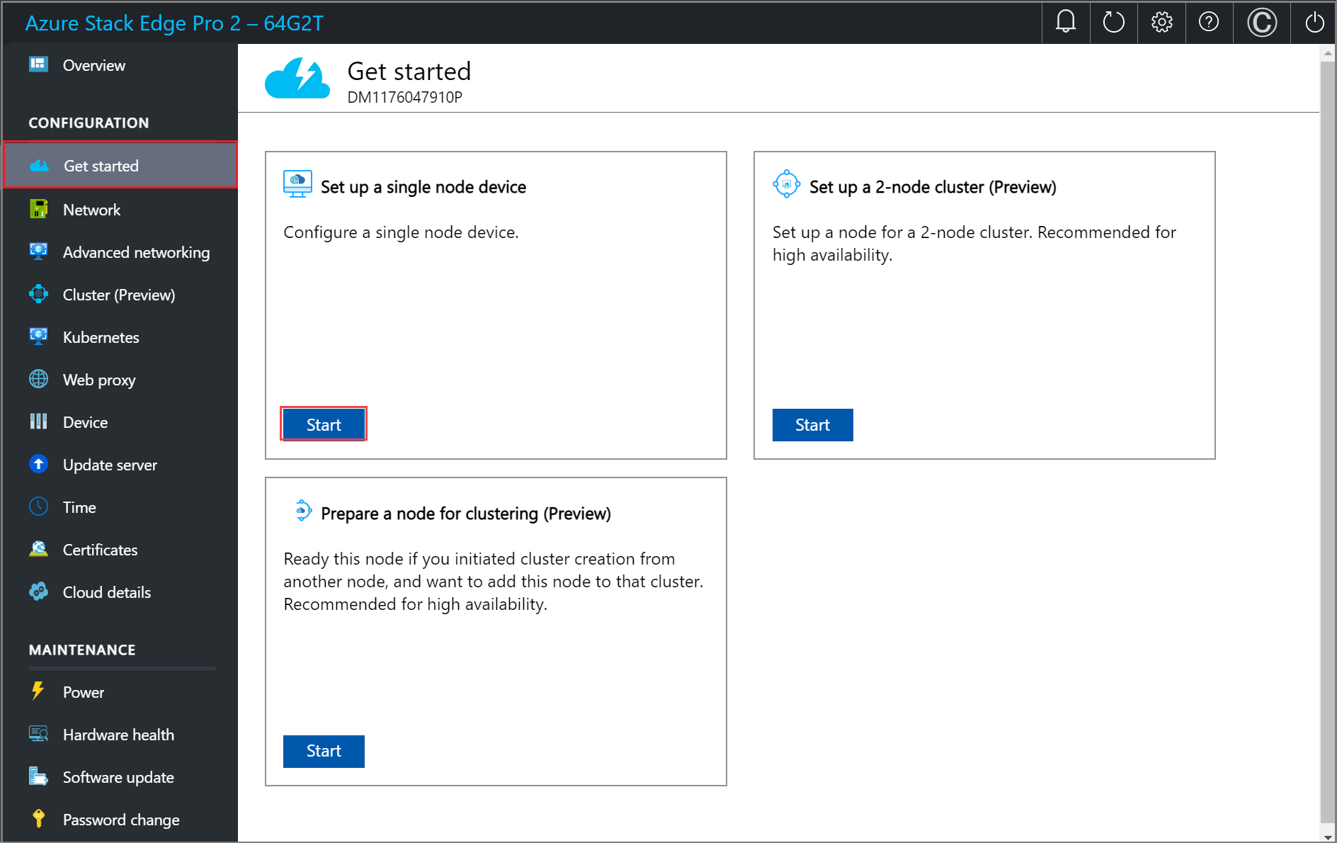In the Set up a 2-node cluster tile, select Start.