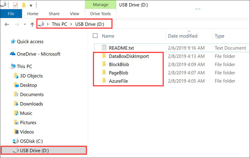 View the contents of the unlocked drive. The list of the precreated folders and subfolders in the drive varies according to the options you select when placing the Data Box Disk order. The creation of extra folders isn't permitted, as copying data to a user-created folder causes upload failures.