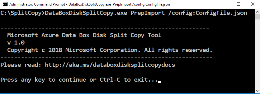 DataBoxDiskSplitCopy.exeusing the following command.DataBoxDiskSplitCopy.exe PrepImport /config:ConfigFile.jsonWhen prompted, press any key to continue running the tool.