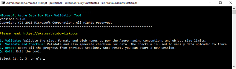 DataBoxDiskValidation.cmdfor checksum validation in the DataBoxDiskImport folder of your drive. This tool is only available for the Windows environment. Linux users need to validate that the source data copied to the disk meets Azure Data Box prerequisites.Choose the appropriate validation option when prompted. We recommend that you always validate the files and generate checksums by selecting option 2. Exit the command window after the script completes. The time required for validation to complete depends upon the size of your data. The tool notifies you of any errors encountered during validation and checksum generation, and provides you with a link to the error logs.