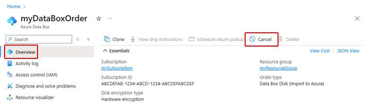 To cancel this order using the Azure portal, navigate to the Overview section and select Cancel from the command bar.