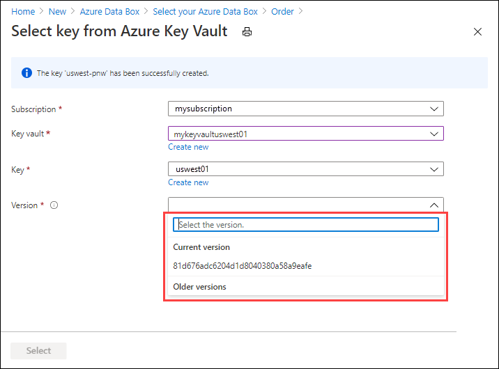 You're notified when the key has been created in your key vault. Your new key is selected on the Select a key blade.