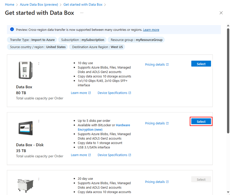 4. Select Data Box Disk. The maximum capacity of the solution for a single order of five disks is 35 TB. You could create multiple orders for larger data sizes.