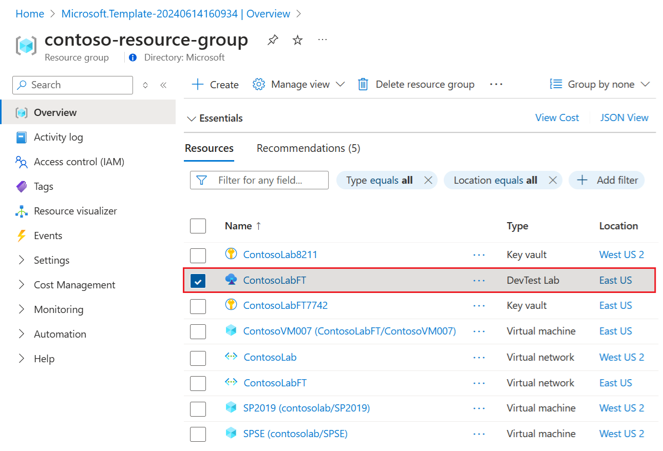 The Resource group page lists the resources in the resource group, including the new lab and its dependent resources like virtual networks and VMs. To open the lab Overview page, select the DevTest Lab resource for your new lab in list: