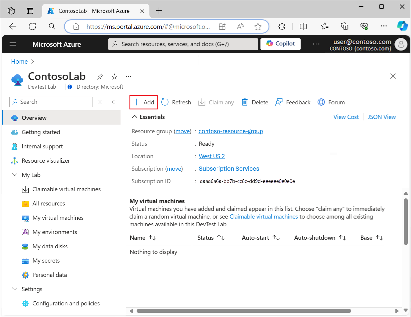 On the lab Overview page, select Add to create a new virtual machine: