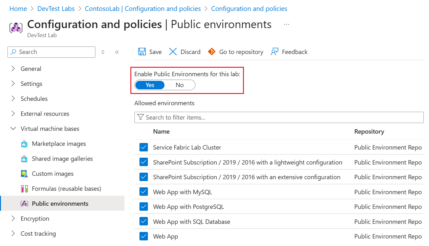 Screenshot that shows how to enable all public environment repositories for an existing lab resource.