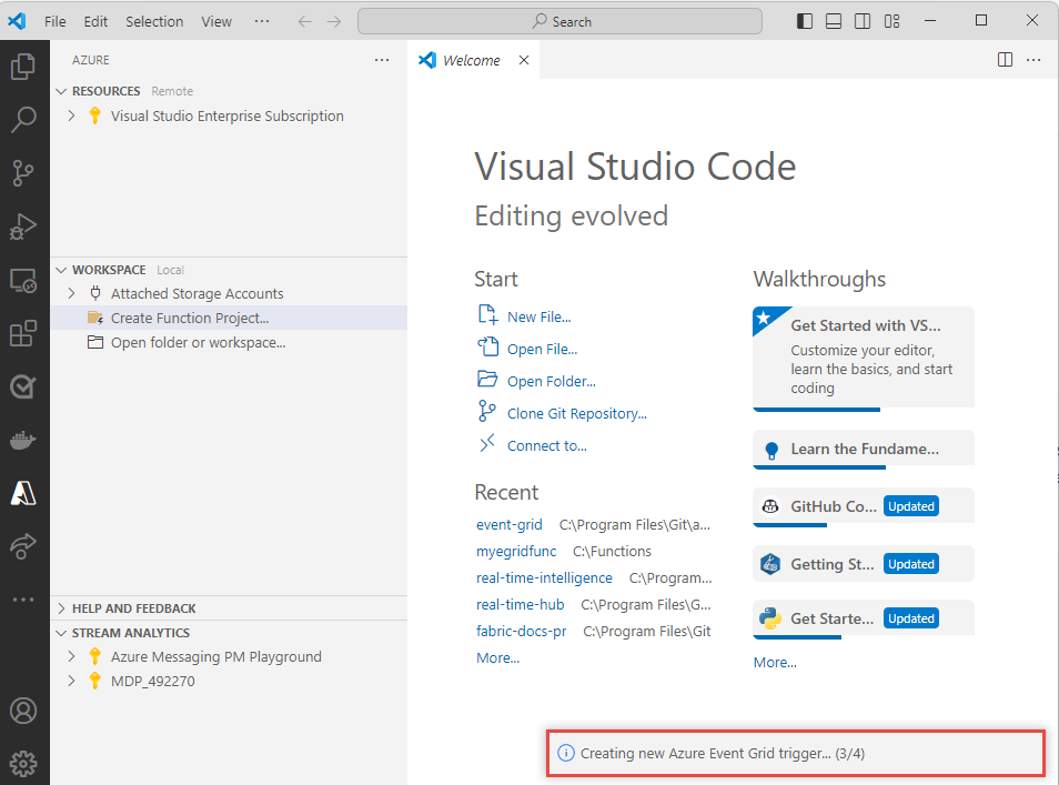 In this section, you use Visual Studio Code to create a function with an Event Grid trigger.