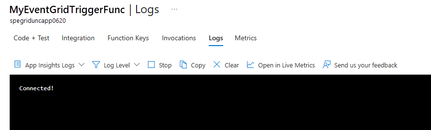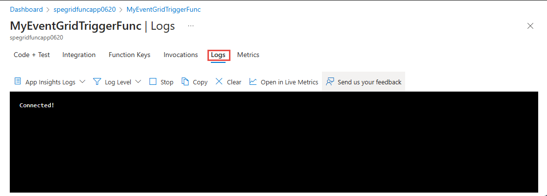12. Switch to the Logs tab. Keep this tab open so that you can see logged messages when you send an event to an Event Grid topic later in this article.