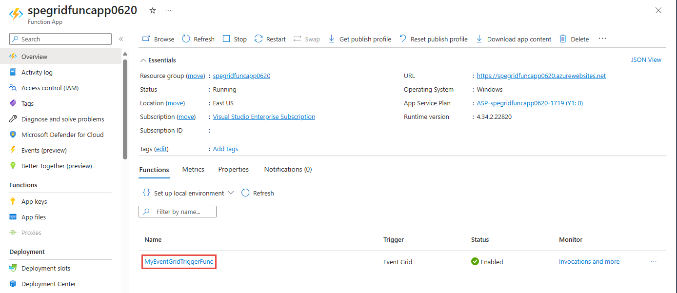 Screenshot that shows the selection of an Azure function on the Function App page.