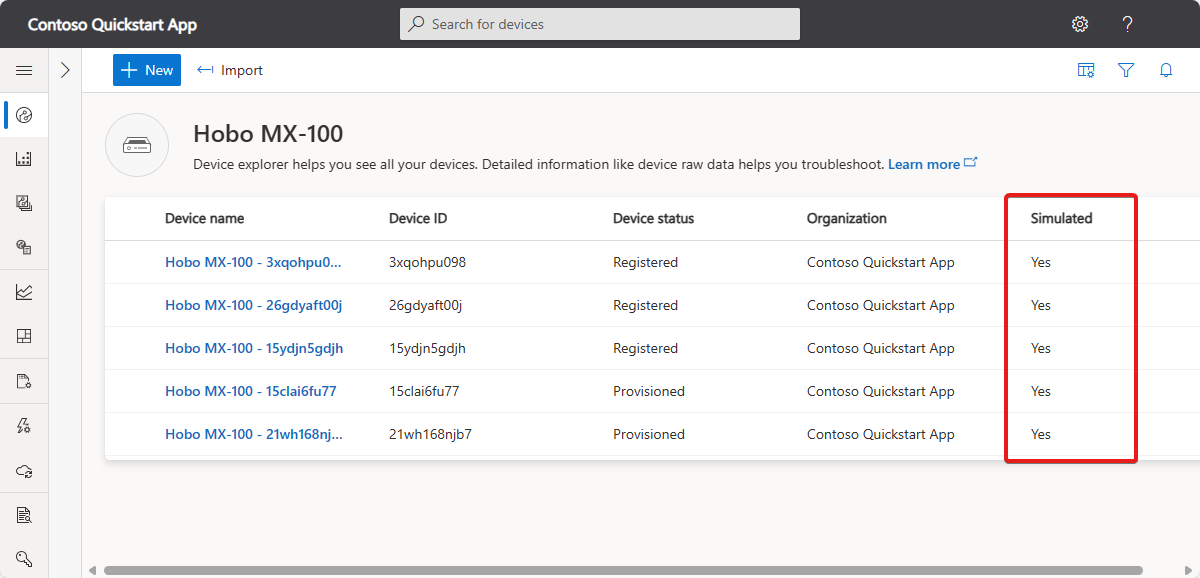 Before you create a device group, add at least five simulated devices based on the Hobo MX-100 device template to use in this tutorial: