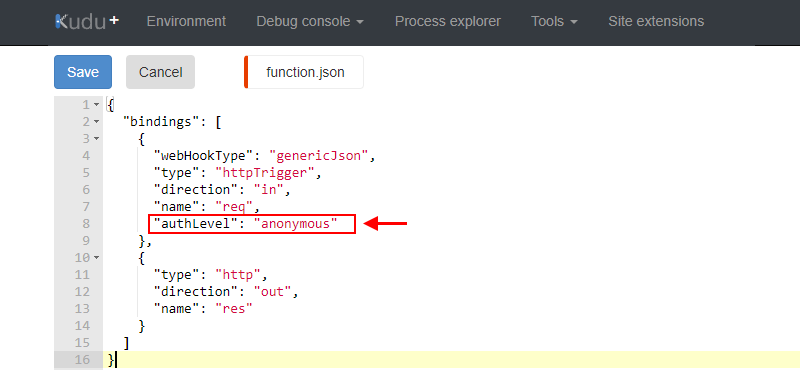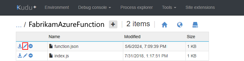 Open the function.json file for editing.