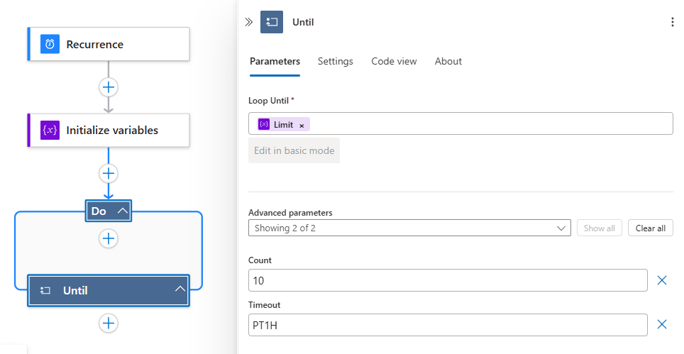 Parameter Value Description Name Limit Your variable's name Type Integer Your variable's data type Value 0 Your variable's starting value Under the Initialize variables action, follow these general steps to add the Control built-in action named Until to your Consumption or Standard logic app workflow.