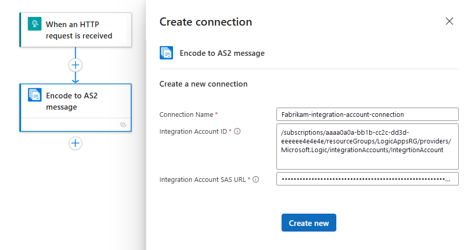 Parameter Required Description Connection Name Yes A name for the connection. Integration Account ID Yes The name for your integration account. Integration Account SAS URL Yes The callback URL for your integration account. For example: