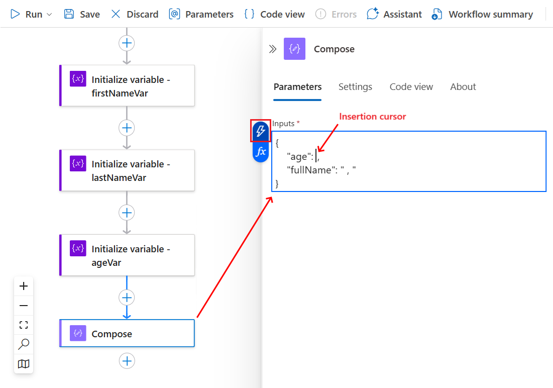 For example, you can construct a JSON message from multiple variables, such as string variables that store people's first names and last names, and an integer variable that stores people's ages. In this example, the Compose action accepts the following inputs: