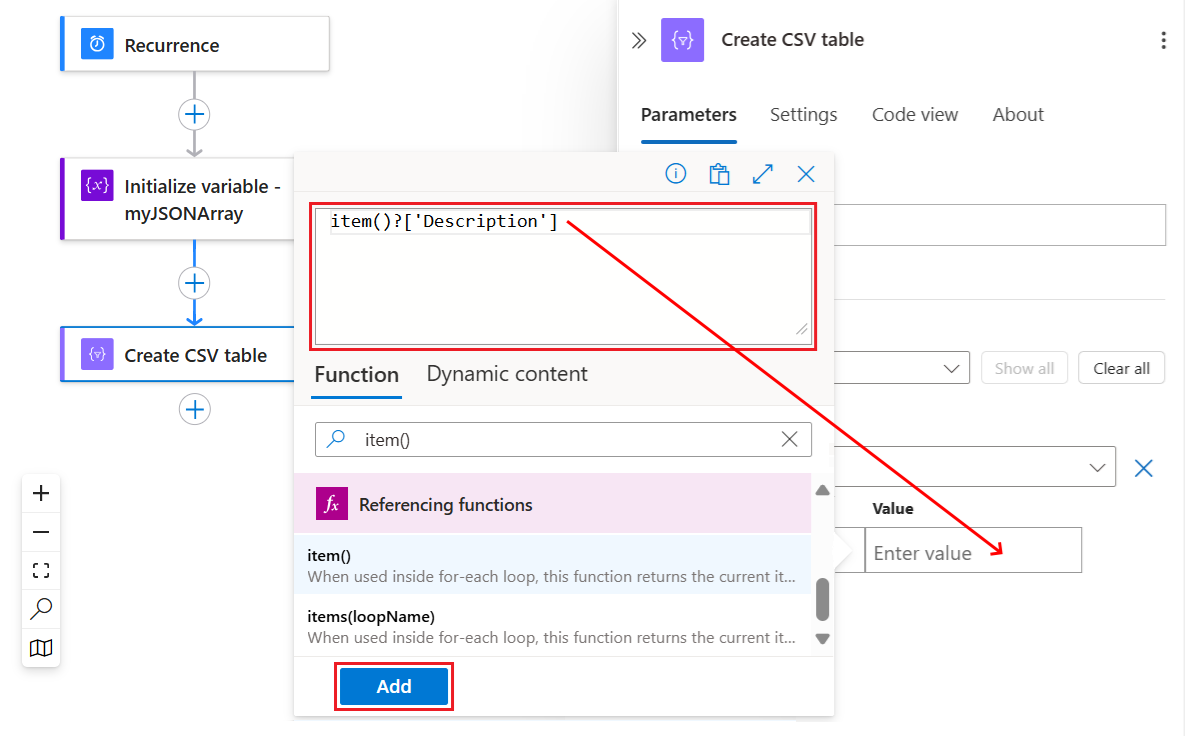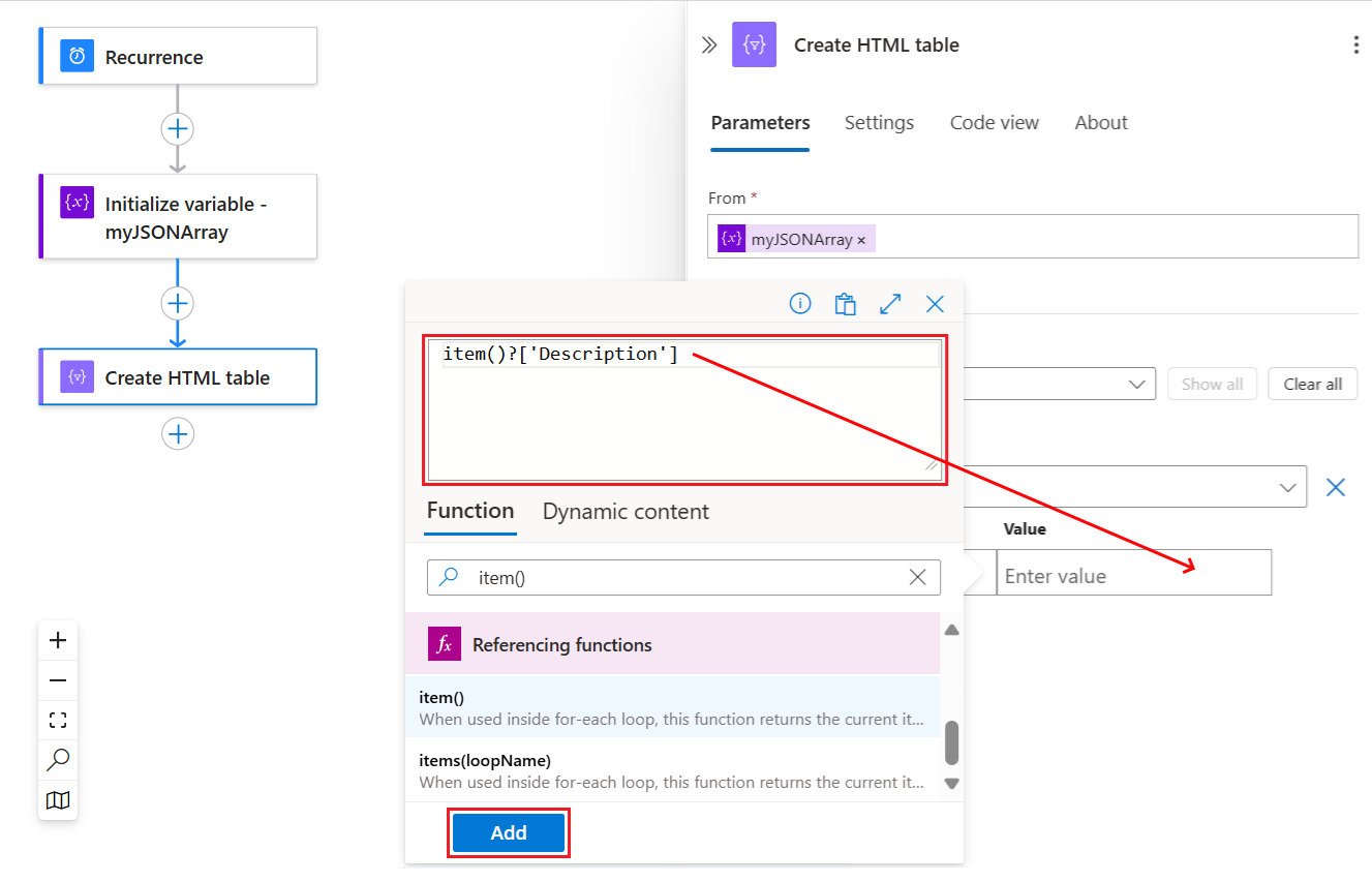 2. In the expression editor, enter the function named item(), and then select Add.