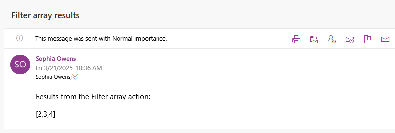 Screenshot shows email with results from action named Filter array.