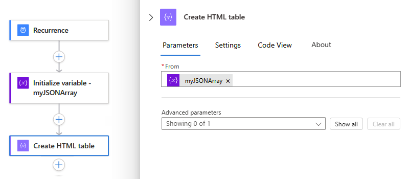 To try the Create CSV table action, follow these steps by using the workflow designer. Or, if you prefer working in the code view editor, you can copy the example Create CSV table and Initialize variable action definitions from this guide into your own logic app's underlying workflow definition: Data operation code examples - Create CSV table. For more information about the Create CSV table action in the underlying JSON workflow definition, see the Table action.