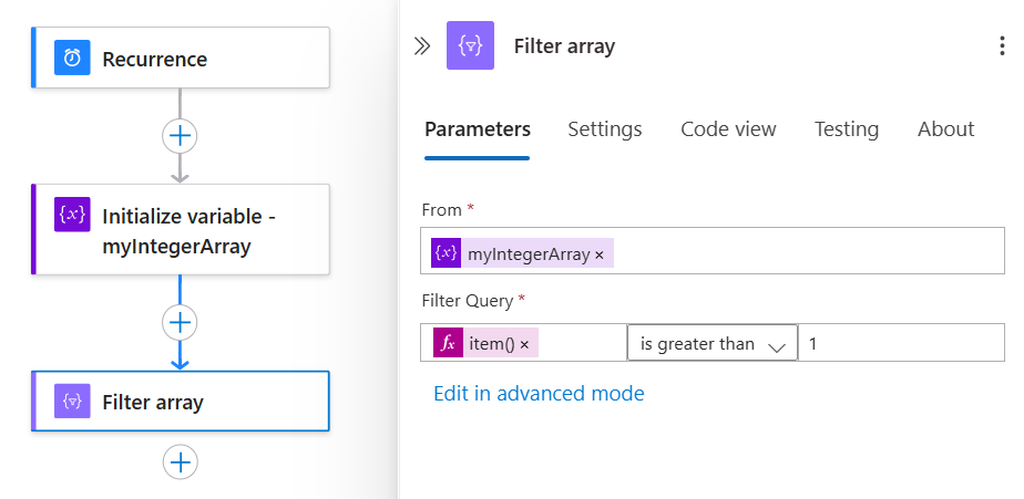 This example uses the Azure portal and a sample workflow with the Recurrence trigger followed by an Initialize variable action. This action is set up to create a variable where the initial value is an array that has some sample integer values.