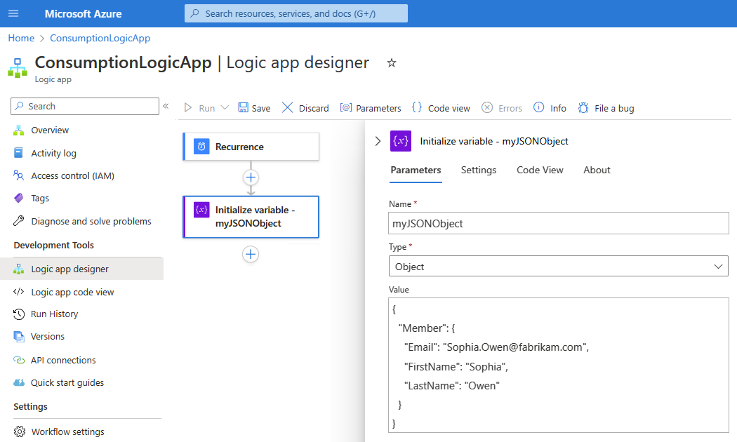 This example uses the Azure portal and a sample workflow with a Recurrence trigger followed by an Initialize variable action. This action is set up to create a variable whose initial value is the following JSON object with properties and values: