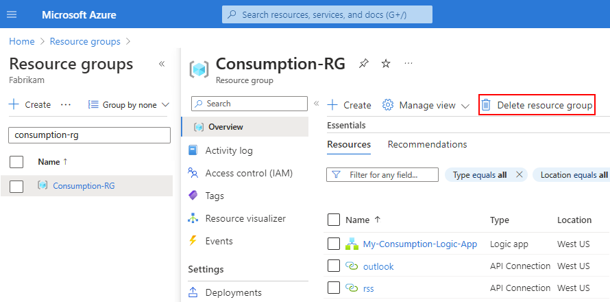 Find and select your logic app's resource group. On the Overview pane, select Delete resource group.