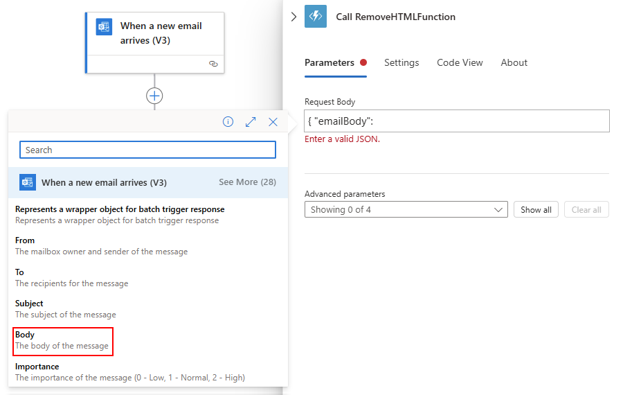 From the dynamic content list, under When a new email arrives, select the Body output. After this value resolves in the Request Body box, remember to add the closing curly brace (}).