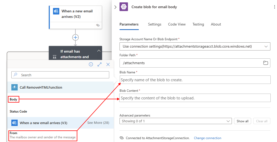 For this example, select the folder icon, and then select attachments.Blob Name Yes <sender-name> For this example, use the sender name as the blob name.