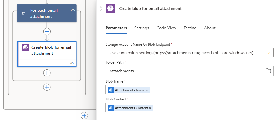 Next, add an action that saves each attachment as a blob in your attachments storage container.