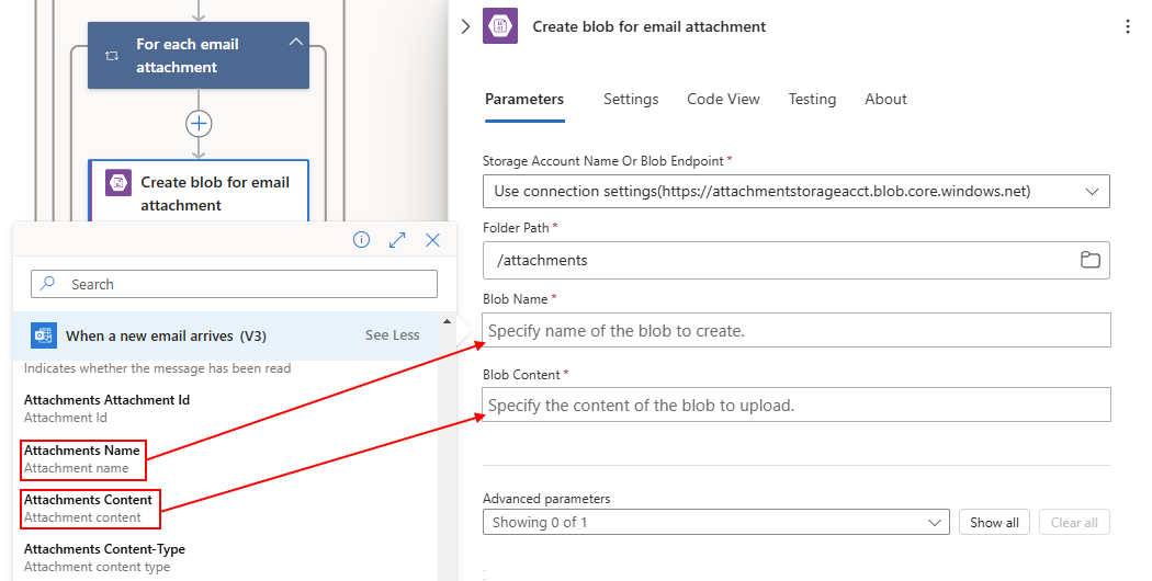 For this example, select the folder icon, and then select attachments.Blob Name Yes <attachment-name> For this example, use the attachment name as the blob name.