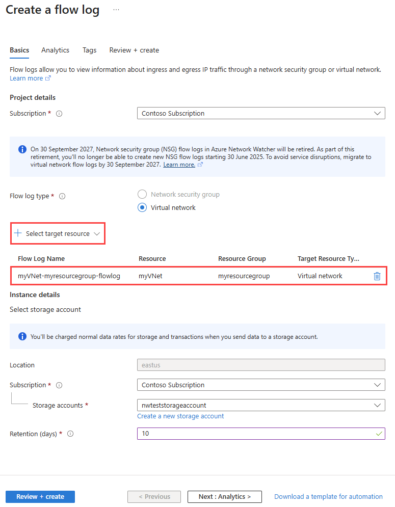 Flow Log Name Leave the default of myVNet-myresourcegroup-flowlog.