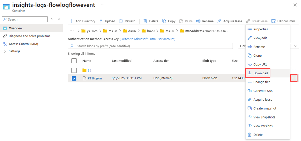 6. Select the ellipsis ... to the right of the PT1H.json file, then select Download.