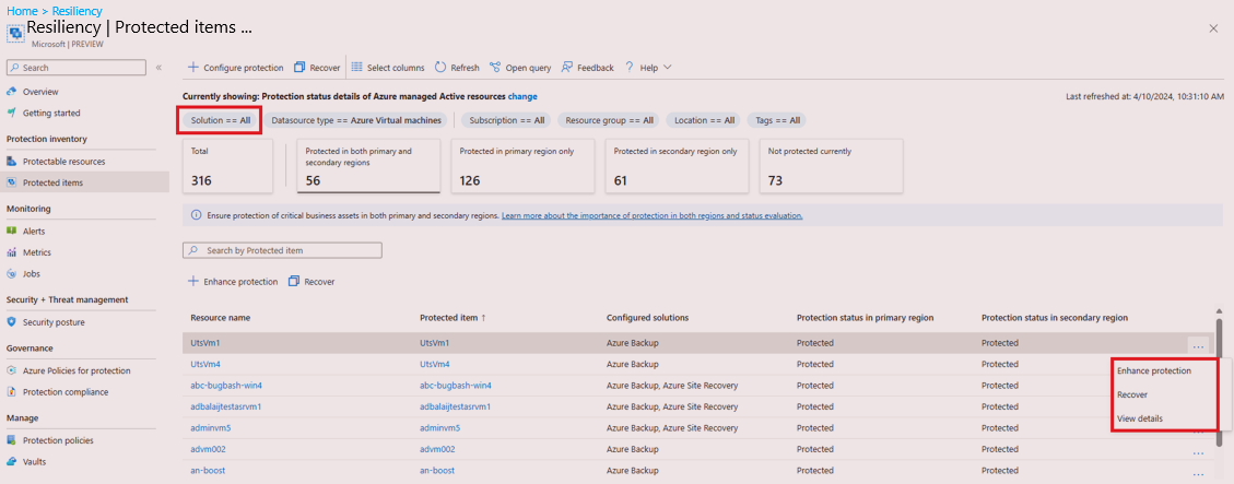 This tutorial describes how to view your datasources that are protected by one or more solutions and perform actions on them from Resiliency in Azure.