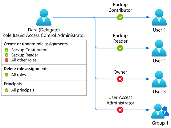 In this example, Dara can only assign the Backup Contributor or Backup Reader roles. Dara can remove any role assignments.