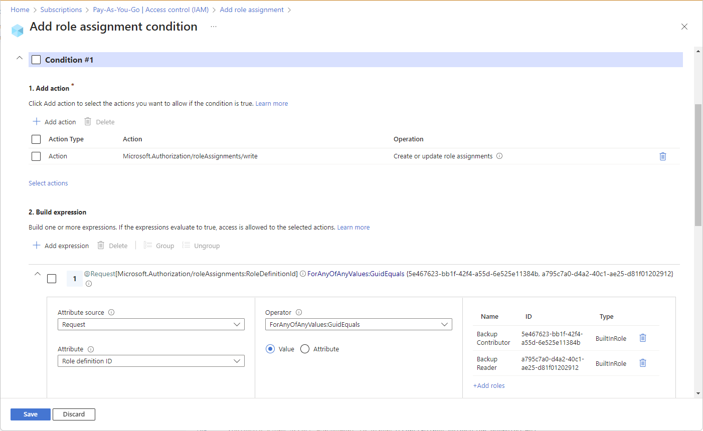 In this example, Dara can only assign (or remove) the Backup Contributor or Backup Reader roles to user or group principal types.