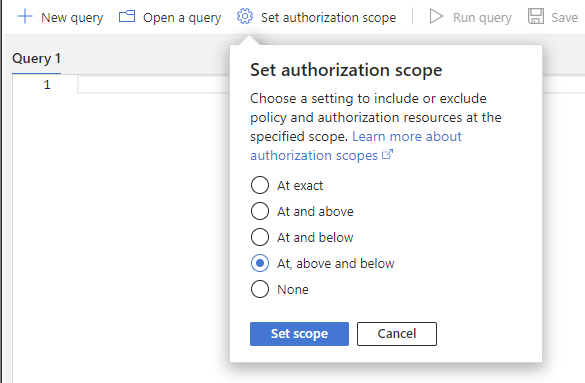 Select Set authorization scope and set the authorization scope to At, above and below to query all resources at the specified scope.