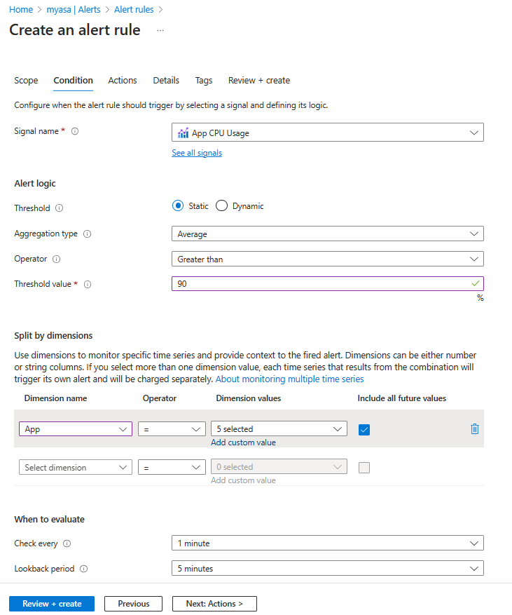 For Alert rule name, enter app-cpu-high-alert.