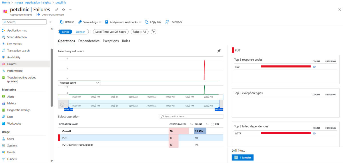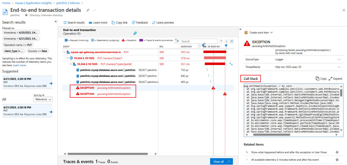 PUToperation that has the most failed requests count, select 1 Samples to go into the details, and then select the suggested sample.Go to the End-to-end transaction details page to view the full call stack in the right panel.