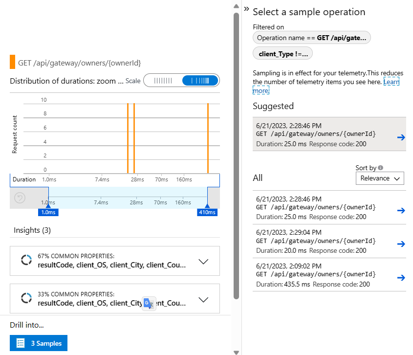 GET /api/gateway/owners/{ownerId}operation, select 3 Samples to go into the details, and then select the suggested sample.Go to the End-to-end transaction details page to view the full call stack in the right panel.