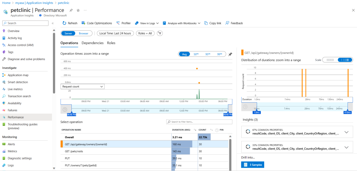 On the navigation menu, select Application Insights to go to the Application Insights overview page. Then, select Performance.
