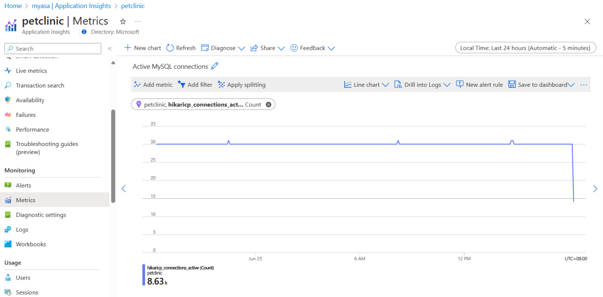 To pin the "Active MySQL connections" chart, use the steps from the Pin the "Availability" chart section. The hikaricp_connection_active metric is under the Log-based metrics namespace.
