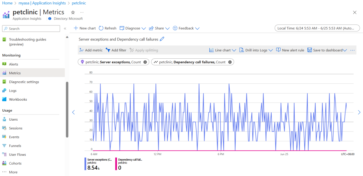 To pin the "Server exceptions and Dependency call failures" chart, use the steps from the Pin the "Availability" chart section. The Server exception and Dependency call failures metrics are under the Application Insights standard metrics namespace.
