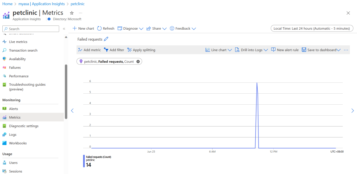 To pin the "Failed requests" chart, use the steps from the Pin the "Availability" chart section. The Failed requests metric is under the Application Insights standard metrics namespace.