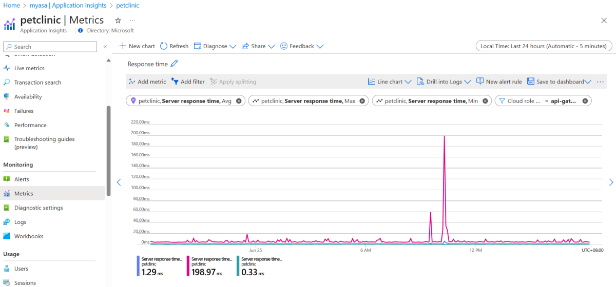 To pin the "Response time" chart, use the steps from the Pin the "Availability" chart section, but add a filter to filter the Cloud role name with api-gateway. The Server response time metric is under the Application Insights standard metrics namespace.