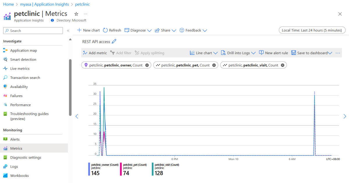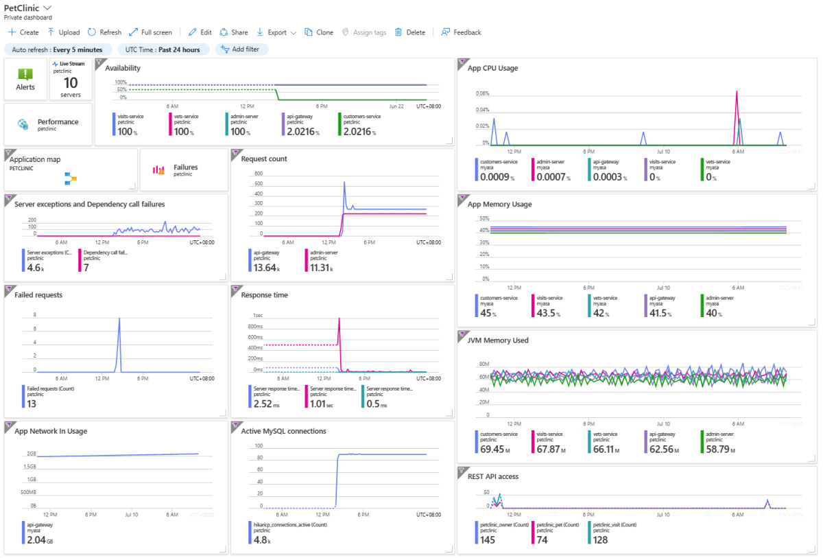 To view the dashboard, go to your private PetClinic dashboard page to edit the tiles in the dashboard for easy monitoring.
