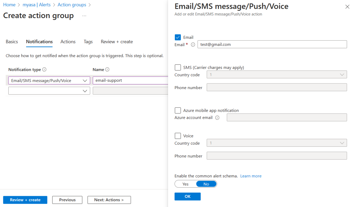 Navigate to the Notification tab on the Create action group page. For Notification type, select Email/SMS message/Push/Voice. For Name, enter email-support.